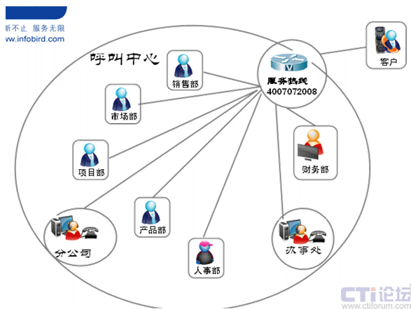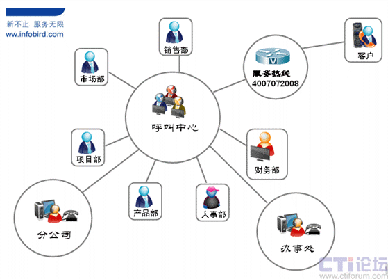 訊鳥軟件現(xiàn)有員工150人,總部位于北京,在上海設(shè)有一個(gè)分公司,在廣州、深圳分別設(shè)有一個(gè)辦事處。通過將呼叫中心與企業(yè)運(yùn)營管理的融合,大大提高了員工的工作效率,降低了運(yùn)營管理成本。訊鳥軟件副總裁姜冬良先生告訴我們,自2007年6月在企業(yè)運(yùn)營管理中加入呼叫中心之后,所有員工對外聯(lián)系的名片上只有公司的400號(hào)碼和員工分機(jī),不再顯示員工的手機(jī),這樣有效的避免了因?yàn)閱T工流失造成的客戶服務(wù)無法及時(shí)響應(yīng)的現(xiàn)象,同時(shí),所有員工的工作狀態(tài)可以通過報(bào)表系統(tǒng)有效的衡量,尤其是銷售人員和分公司、辦事處人員的工作,管理層可以及時(shí)的檢查、監(jiān)督和糾正。