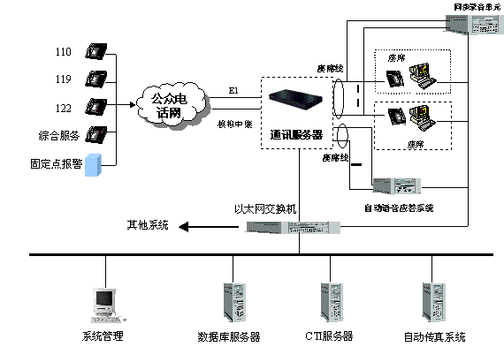 綜合接警平臺主要由hxd09可編程智能語音交換機(jī)和計算機(jī)網(wǎng)絡(luò)兩部分組成,交換機(jī)負(fù)責(zé)110、119、122報警電話的接入與分流及調(diào)度呼出等功能;計算機(jī)網(wǎng)絡(luò)則完成110、119、122報警信息的顯示、數(shù)據(jù)儲存、統(tǒng)計及信息查詢、發(fā)布功能。