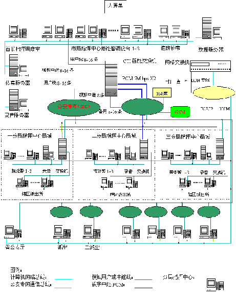 - 樹立大網(wǎng)絡(luò)概念:采用先進(jìn)的通訊、計算機(jī)網(wǎng)絡(luò)技術(shù)(采用CTI可編程交換技術(shù)),利用現(xiàn)有的通信資源,實(shí)現(xiàn)市局指揮中心與消防大隊、交警大隊、各派出所的計算機(jī)網(wǎng)絡(luò)及相關(guān)領(lǐng)導(dǎo)辦公室計算機(jī)大聯(lián)網(wǎng);形成全市范圍內(nèi)110、119、122有線、無線全方位立體調(diào)度語音通道大網(wǎng)。