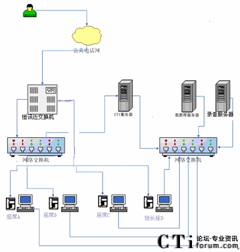 根據(jù)以上業(yè)務設計框架,我們確定了客服中心搭建時所需要的設備,系統(tǒng)的網(wǎng)絡拓撲結構圖如下:
