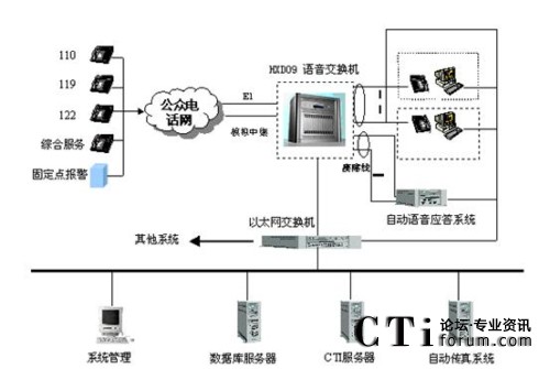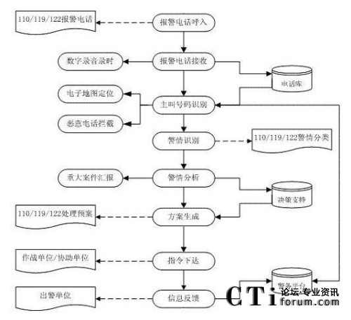 該系統(tǒng)主要分為電信子系統(tǒng)(完成聯(lián)動中心與各電信公司之間話音的傳輸、交換和分配,以及主叫號碼和主叫地址的自動查詢和傳輸?shù)龋⒔泳行淖酉到y(tǒng)(統(tǒng)一接聽和處理市民的報警、求助電話)、指揮調(diào)度子系統(tǒng)(或稱為處警中心,通過直觀的地理信息系統(tǒng)和數(shù)據(jù)庫,可以對所有的資源和警力分布了如指掌。通過一體化的無線數(shù)據(jù)傳輸和無線調(diào)度臺進行方便的統(tǒng)一管理,指揮和調(diào)度)、信息網(wǎng)絡子系統(tǒng)(聯(lián)動中心的骨干網(wǎng)絡,把各種數(shù)據(jù)數(shù)庫、接處警席位、移動的警用車載計算機等互聯(lián)在一起,形成一個強大的信息網(wǎng)絡)、無線指揮調(diào)度通信子系統(tǒng)、大屏幕顯示子系統(tǒng)、地理信息子系統(tǒng)、GPS/GIS子系統(tǒng)。