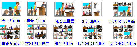 華為高清視訊系統(tǒng)采用了數(shù)字多畫面合成技術(shù),系統(tǒng)全面提供2、3、4、6、8、9、13、16等不同的9種畫面組合模式,在會(huì)議過(guò)程中,多畫面的格式可以通過(guò)主席或管理員隨意切換,同時(shí)會(huì)議過(guò)程中也可以在單多畫面之間的自由切換。支持的多畫面組合模式如下: