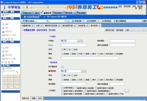 與其說是外籍勞工保護(hù)專案,其實(shí)也是雇主申訴專線,本專案須整合中華電信代理的COSMO軟體電話功能,及導(dǎo)入服務(wù)及客服模組,當(dāng)電話來電時(shí),客服員案下軟體電話接聽時(shí),同時(shí)利用來電電話搜尋并帶入當(dāng)通來電者資料及歷史申訴案件至畫面上,如果需要建立申訴案件,也可以使用服務(wù)請(qǐng)求將申訴案件儲(chǔ)存于系統(tǒng)中,或是需要咨詢答覆時(shí),也只要將關(guān)鍵字輸入至知識(shí)庫(kù)的查詢方案中,在短時(shí)間找到答案馬上做回覆,讓作業(yè)更有效率。本專案角色分為接線服務(wù)員、業(yè)務(wù)督導(dǎo)、行政管理及全省25個(gè)縣市政府機(jī)關(guān)人員。接線服務(wù)員是第一線的電話服務(wù)窗口,接電話同時(shí)須視電話內(nèi)容新增服務(wù)請(qǐng)求,并做判斷是否可以即時(shí)線上結(jié)案,如果不行結(jié)案,則可使用該服務(wù)請(qǐng)求(派案單)下新增任務(wù),將任務(wù)分配至全省25個(gè)縣市政府機(jī)關(guān)人員,各縣市人員收到任務(wù)(回覆單),也可以活動(dòng)(紀(jì)錄單)線上回覆派案處理狀況,并做結(jié)案,系統(tǒng)可依照設(shè)定的審核流程請(qǐng)求同意結(jié)案。