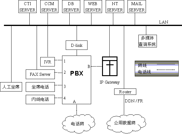 上圖所示的分布于不同地區(qū)的多個(gè)系統(tǒng)可以互相聯(lián)接,構(gòu)成分布式客戶服務(wù)中心,如地市話務(wù)員回答不了客戶的問題,可轉(zhuǎn)接到省中心,話務(wù)員在坐席上操作請求CCM轉(zhuǎn)接省中心,CCM通過CTI SERVER控制PBX將A與B接通,IP網(wǎng)關(guān)響應(yīng)呼叫,將電話號碼信號翻譯成相關(guān)的IP地址,將線路上的語音信號處理成數(shù)據(jù)信息并打包,通過本地LAN、本地ROTUER、公用數(shù)據(jù)網(wǎng)、省中心LAN等發(fā)送到省中心的IP網(wǎng)關(guān)、呼叫到達(dá)省中心PBX的B,按省中心系統(tǒng)的排隊(duì)和選擇坐席的規(guī)則選擇坐席,省中心的IP網(wǎng)關(guān)將接收到的數(shù)據(jù)解包還原成語音信號通過B送坐席電話3,雙方通話。這樣全省各市縣將聯(lián)結(jié)成一個(gè)大的分布式呼叫中心,同時(shí)IP電話也可用于企業(yè)內(nèi)部通信,通信費(fèi)將降至原來的一半以下。