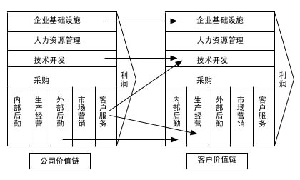 企業(yè)的主要活動都是具有相應(yīng)價值的,這些活動構(gòu)成了企業(yè)的價值鏈,企業(yè)價值鏈?zhǔn)紫缺憩F(xiàn)為企業(yè)內(nèi)部的聯(lián)系和支撐,各種活動相互配合,才能產(chǎn)生價值和利潤;其次,企業(yè)的活動和上游供貨商和下游用戶緊密聯(lián)系,相互影響。顯然,供貨商、用戶的各種活動方式能夠直接或者間接地影響企業(yè)的成本、利潤和競爭優(yōu)勢,同樣,企業(yè)的各種活動也將對它們產(chǎn)生很大的影響。
