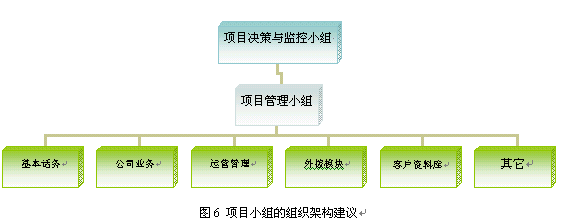 。。4.2 成立共同的項目小組,盡可能分模塊負責。需求方一個項目小組,開發(fā)方一個項目小組,雙方派出項目經(jīng)理的方式往往不能滿足Call Center這樣復雜的系統(tǒng)需要。建議雙方建立共同的項目小組,充分溝通與合作,控制項目的范圍和質(zhì)量。圖6 是項目小組的建議。