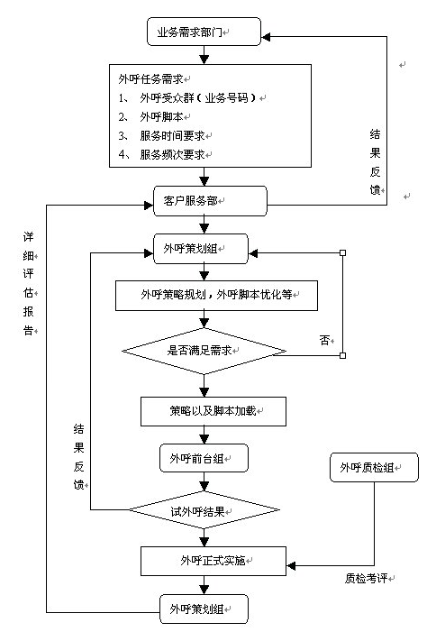 3、設立外呼策劃班組,負責與各業(yè)務需求部門接口,負責整個外呼策略的策劃,負責整個外呼計劃的實施,負責外呼腳本的編寫,負責外呼結果的評估等工作。