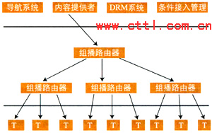 IPTV業(yè)務(wù)提供者可以根據(jù)用戶的請(qǐng)求,利用IP網(wǎng)絡(luò)本身所提供的組播能力將視頻信息以組播的方式傳送給用戶。此時(shí),同時(shí)向相同的業(yè)務(wù)提供者請(qǐng)求發(fā)送相同內(nèi)容信息的用戶,可以由業(yè)務(wù)提供者安排在同一個(gè)組播組中接收到相同的信息。為給內(nèi)容提供者提供知識(shí)產(chǎn)權(quán)保護(hù),業(yè)務(wù)提供者提供條件接入控制。同時(shí)為減少骨干網(wǎng)絡(luò)傳輸?shù)膲毫,業(yè)務(wù)提供者在向眾多的用戶提供組播式業(yè)務(wù)時(shí)可以利用多級(jí)組播的形式來(lái)實(shí)現(xiàn)。組播式IPTV業(yè)務(wù)可能的系統(tǒng)模型示意如圖1所示。