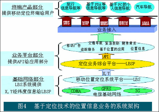 其中在基礎(chǔ)網(wǎng)絡(luò)層面中,LBS系統(tǒng)提供X、Y經(jīng)緯度信息,并把信息傳遞到定位業(yè)務(wù)綜合平臺。提供不同位置應(yīng)用的平臺部分通過接口的方式獲取位置信息,進(jìn)行面向特定業(yè)務(wù)的計算。終端用戶通過移動終端并以不同的接入方式獲取位置類的信息服務(wù)。