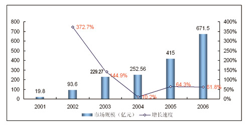 圖 2001-2006年中國(guó)移動(dòng)用戶增值業(yè)務(wù)市場(chǎng)規(guī)模