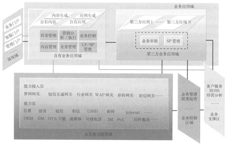 *業(yè)務(wù)能力提供區(qū):由于目前主要業(yè)務(wù)能力提供系統(tǒng)已實現(xiàn)接口的標(biāo)準(zhǔn)化,可采用邏輯上劃分應(yīng)用層和能力、資源層,并統(tǒng)一管理調(diào)用該能力提供功能的SP及用戶信息;