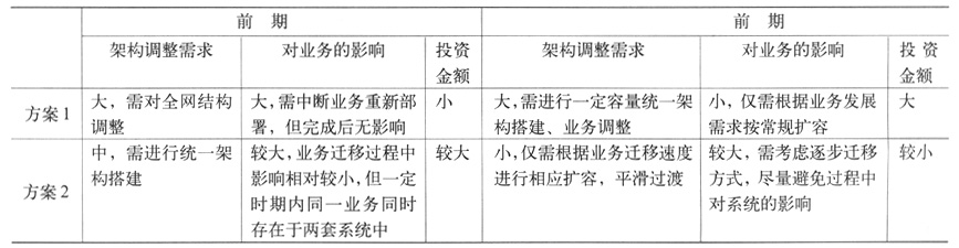 根據(jù)網(wǎng)絡(luò)演進架構(gòu)清晰度、實施難度、投資金額等綜合因素考慮,對以上方案分析對比如表1所示。
