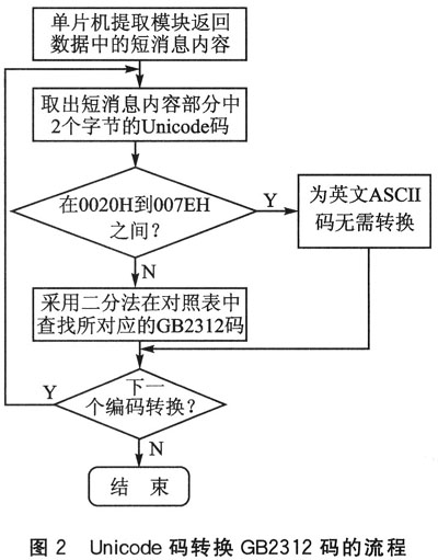 單片機(jī)通過串口與模塊連接后,發(fā)送讀取第一條新短消息指令:“AT+CMGR=1”。提取模塊接收的短消息后,先判斷其內(nèi)容是否為ASCII碼。若為ASCII碼,則無需轉(zhuǎn)換直接讀;否則,通過查表法查找其對(duì)應(yīng)的漢字GB碼,實(shí)現(xiàn)不同編碼間的轉(zhuǎn)換。轉(zhuǎn)換流程如圖2所示。