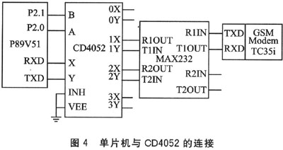 CD4052實(shí)際上是2個(gè)一分四的數(shù)據(jù)分配器,所擴(kuò)展的串口均是全雙工異步工作模式,具有很高的工作速度,方便地實(shí)現(xiàn)了一片單片機(jī)多個(gè)串口的擴(kuò)展能力。以Siemens公司的TC35i GSM模塊為編程對(duì)象,通過P89 V51單片機(jī)進(jìn)行控制,構(gòu)建了實(shí)際系統(tǒng),實(shí)現(xiàn)了編程過程以及系統(tǒng)串口擴(kuò)展等,有效地接收并完成中文短消息代碼的轉(zhuǎn)換,驗(yàn)證了上述構(gòu)建思路的可行性和正確性。