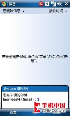 當(dāng)有新郵件時,SEVEN就會提示用戶有未讀郵件,真正做到了即時收取,彌補了WM系統(tǒng)的不足,對于眾多需要隨時收發(fā)郵件的白領(lǐng)來說非常貼心。不過,SEVEN只能添加3個郵件帳戶,看來郵件狂人只能根據(jù)郵箱的重要性,選擇性的使用Push功能了。