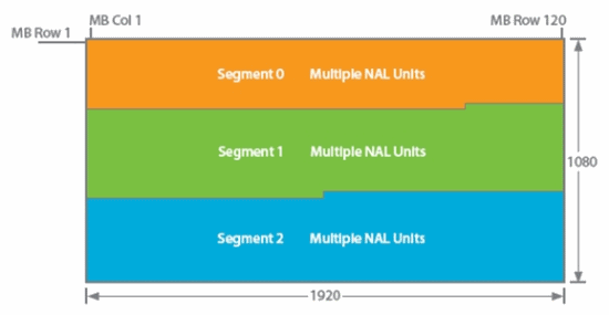在這種架構(gòu)中,編碼器的實(shí)施分配到多個(gè) DSP 內(nèi)核。每個(gè)宏塊條都分配到一個(gè)DSP內(nèi)核。其中每個(gè)內(nèi)核都提供一些特定功能,如:速率控制與幀內(nèi)圖像處理。事實(shí)上,無(wú)法預(yù)先進(jìn)行比特預(yù)算并分配到各個(gè)宏塊條,因?yàn)椴煌陦K條可能具有不同的圖像復(fù)雜性,而在圖像分割塊之間采用差異很大的Qp值會(huì)造成合成圖像的層邊界出現(xiàn)偽影。在H.264中,宏塊條NAL可以包含任意數(shù)量的宏塊,因此與H.263不同,圖像分割塊的形狀無(wú)需符合GOB邊界。每個(gè)宏塊條的頭部(slice