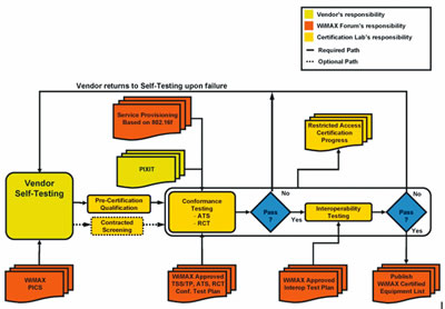 WiMAX認(rèn)證程序2004年10月被批準(zhǔn),到2005年中期開始正式實行。整個認(rèn)證流程對物理層和媒體接入層(MAC)進(jìn)行兩種類型的測試,即性能測試和互通性測試。前者是為了確保設(shè)備可以正確實現(xiàn)由IEEE802.16以及ETSIHiperMAN標(biāo)準(zhǔn)給定的技術(shù)規(guī)范,而后者是檢驗不同廠家的產(chǎn)品在同一網(wǎng)絡(luò)中的協(xié)同工作情況,互通性測試要求至少三家以上不同公司的設(shè)備參與,它們具有相同的系統(tǒng)配置文件(頻譜波段、信道寬度以及雙工方式)。
