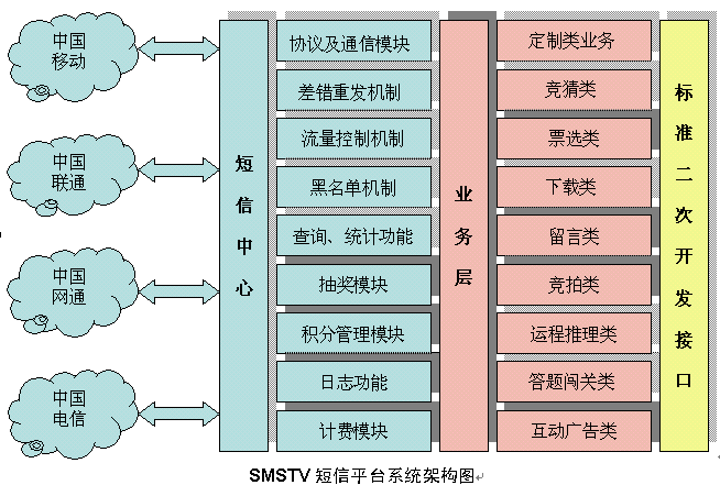 SMSTV短信增值平臺(tái)產(chǎn)品由通信層(短信中心)、業(yè)務(wù)層(業(yè)務(wù)平臺(tái))和接口層(標(biāo)準(zhǔn)二次開發(fā)接口)三層組成(參見2.2.2系統(tǒng)架構(gòu)圖),三層之間通過(guò)專有網(wǎng)絡(luò)協(xié)議互聯(lián),實(shí)現(xiàn)高速數(shù)據(jù)通信。