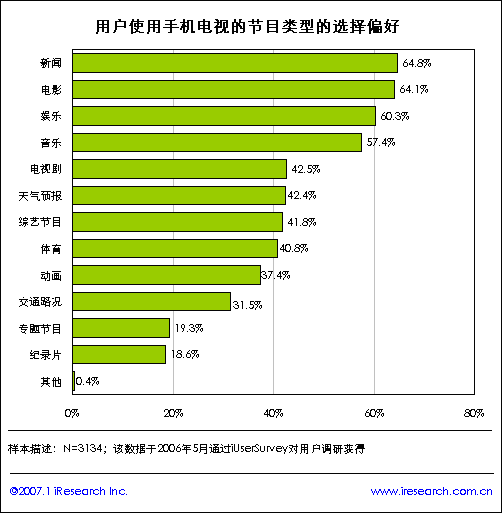 iReserach艾瑞市場(chǎng)咨詢《2007年手機(jī)電視研究報(bào)告》研究結(jié)果顯示,手機(jī)終端價(jià)格將是影響用戶使用手機(jī)電視業(yè)務(wù)的首要驅(qū)動(dòng)因素,其次是手機(jī)電視服務(wù)資費(fèi)標(biāo)準(zhǔn)。另外研究數(shù)據(jù)發(fā)現(xiàn),手機(jī)用戶希望在手機(jī)電視上看到的內(nèi)容類別情況:新聞、電影、娛樂(lè)和音樂(lè)是用戶首要選擇的電視節(jié)目類型,用戶的提及率均在60%以上,另外用戶希望能夠通過(guò)手機(jī)看電視劇、天氣預(yù)報(bào)、綜合節(jié)目和體育等節(jié)目類型。由此發(fā)現(xiàn),新聞、娛樂(lè)和生活類資訊是用戶期望手機(jī)電視節(jié)目的重要類型。