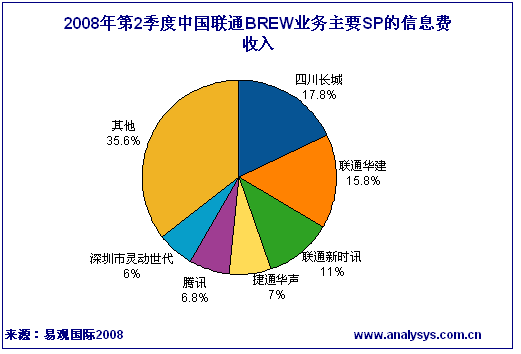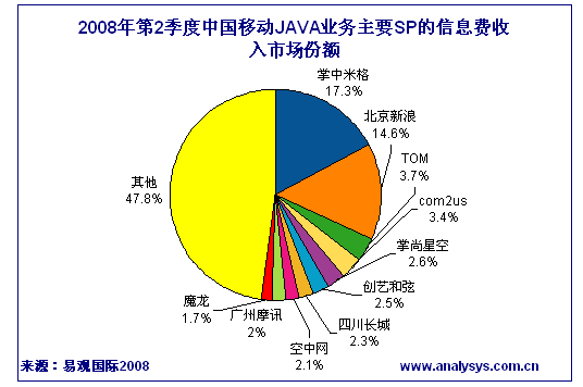 易觀國際近期發(fā)布《2008年第2季度中國手機(jī)游戲市場季度監(jiān)測》顯示:中國移動JAVA業(yè)務(wù)SP信息費(fèi)方面,掌中米格、北京新浪分居前兩名,兩者市場占有率已提高至31.9%。其中掌中米格信息費(fèi)季度收入達(dá)到2505.86萬元,市場占比為17.3%,而新浪信息費(fèi)收入市場占比為14.6%。信息費(fèi)收入的第3至第5名依次為TOM、com2us、掌尚星空,三者總市場占比為9.7%。