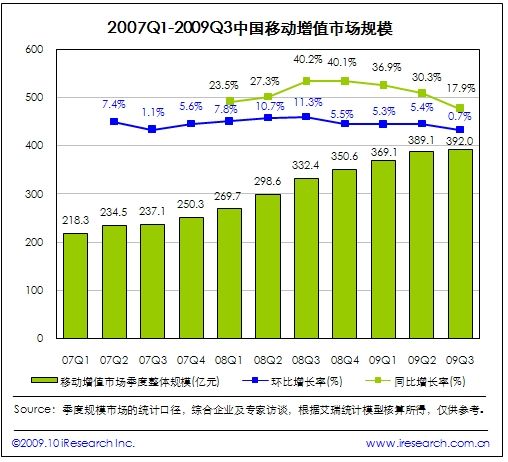 2009Q3中國移動(dòng)增值市場規(guī)模達(dá)392.0億元,同比增長17.9%,環(huán)比增長0.7%。