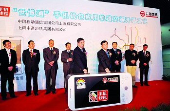 圖:為上海市常務(wù)副市長楊雄、中國移動副總裁李正茂共同啟動“世博通”手機(jī)錢包軌道交通應(yīng)用。