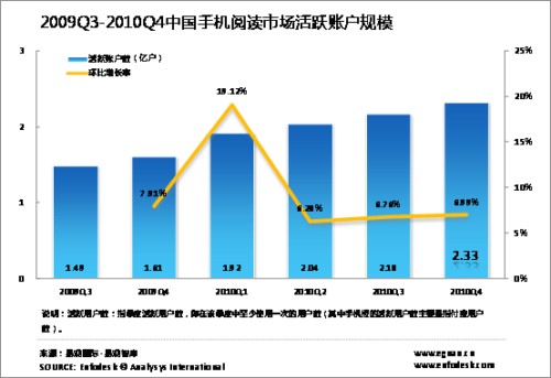 據(jù)Enfodesk易觀智庫最新數(shù)據(jù)顯示,2010年第4季度中國手機閱讀市場活躍用戶數(shù)達2.33億,環(huán)比增長7.03%,同比增長幅度達44.60%。