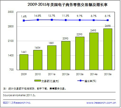 iResearch艾瑞咨詢根據(jù)美國商務(wù)部公布的數(shù)據(jù)發(fā)現(xiàn),2010年美國電子商務(wù)零售市場實現(xiàn)金融危機(jī)以來的首次強(qiáng)勁復(fù)蘇,其銷售額達(dá)1654億美元,較2009年同比增長14.8%。同時,根據(jù)eMarketer的美國電子商務(wù)零售預(yù)測模型獲得的數(shù)據(jù)顯示,2011年美國電子商務(wù)零售交易額將達(dá)到1881億美元。隨著電子商務(wù)的不斷成熟,一直到2015年期間美國電子商務(wù)零售交易額將保持穩(wěn)定健康的增長,且增長率趨于持續(xù)小幅降低。