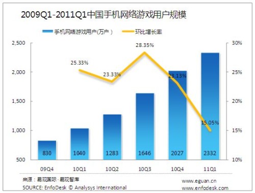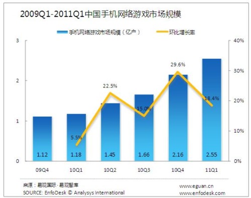 2011年第1季度中國手機網(wǎng)絡游戲市場規(guī)模達2.55億