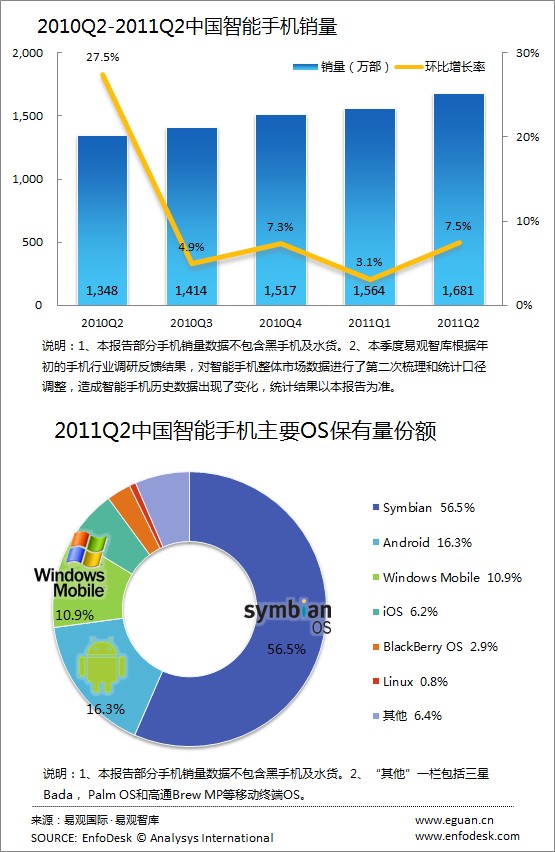 易觀國(guó)際(Analysys International)預(yù)計(jì),未來(lái)3-4個(gè)季度內(nèi)Android的高速發(fā)展仍然是智能手機(jī)市場(chǎng)的最主要推進(jìn)力。但是WP7、MeeGo和蘋果下代iPhone即將入華,而且阿里巴巴和中國(guó)聯(lián)通等巨頭也在著手推出自有的移動(dòng)終端OS。在這樣的情況下,2011年下半年的中國(guó)智能手機(jī)市場(chǎng)格局充滿著許多不確定性,F(xiàn)在斷言Android能夠主導(dǎo)未來(lái)也為時(shí)過(guò)早。