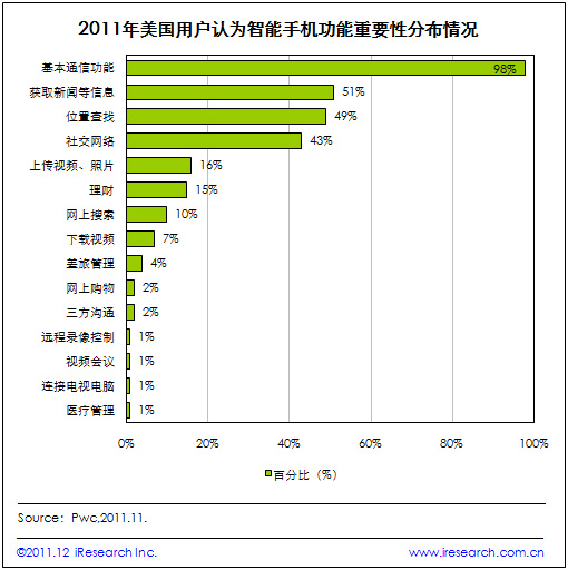 艾瑞咨詢根據(jù)Pwc近日發(fā)布的美國移動互聯(lián)網(wǎng)用戶演變研究報告發(fā)現(xiàn),用戶對移動設備的使用和依賴程度增強,同時,通過對用戶使用智能手機功能的調查發(fā)現(xiàn),用戶認為最重要的功能主要集中在基本通信、獲取資訊信息、位置查找和社交網(wǎng)絡上。