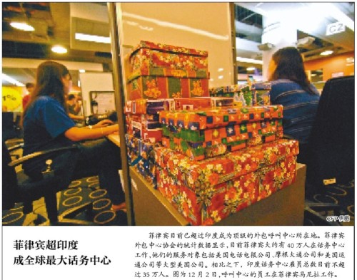 菲律賓目前已超過(guò)印度成為頂級(jí)的外包呼叫中心所在地。菲律賓外包中心協(xié)會(huì)的統(tǒng)計(jì)數(shù)據(jù)顯示,目前菲律賓大約有40萬(wàn)人在話務(wù)中心工作,他們的服務(wù)對(duì)象包括美國(guó)電話電報(bào)公司、摩根大通公司和美國(guó)運(yùn)通公司等大型美國(guó)公司。相比之下,印度話務(wù)中心雇員總數(shù)目前不超過(guò)35萬(wàn)人。