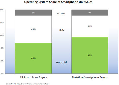 Android和iPhone一共占據(jù)了第四季度智能手機銷售總量的90%。Android在四季度依舊保持了48%的智能手機市場份額,同時Android設(shè)備在首次購買智能手機的消費者群中表現(xiàn)更好。根據(jù)NPD每月提供的Smartphone Track服務(wù)的最新數(shù)據(jù),所有在第四季度初次購買智能手機的消費者中,其中57%的消費者選擇了Android設(shè)備,而相比較下只有34%的消費者選擇了iPhone。