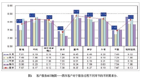 客戶服務(wù)MOT地圖(圖1)——該模塊通過對10086熱線服務(wù)過程的全景式展示,直觀表現(xiàn)不同地區(qū)、不同品牌客戶在10086熱線服務(wù)不同環(huán)節(jié)上的核心需求,話務(wù)員通過本模塊,可以迅速把握10086熱線服務(wù)的要點(diǎn);