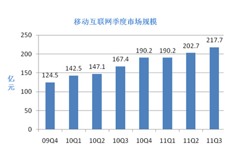 上圖是易觀國際發(fā)布的移動(dòng)互聯(lián)網(wǎng)的相關(guān)數(shù)據(jù),數(shù)據(jù)截止到2011年第三季度,該圖顯示,2009年全球經(jīng)濟(jì)復(fù)蘇之后,移動(dòng)互聯(lián)網(wǎng)業(yè)務(wù)收入一直保持著良好的增長狀態(tài),最新數(shù)據(jù)表明,2011年移動(dòng)互聯(lián)網(wǎng)的整體市場規(guī)模已達(dá)到851億,遠(yuǎn)超過2010年的637億,增長率將近33.6%,在移動(dòng)互聯(lián)網(wǎng)業(yè)務(wù)子領(lǐng)域中,表現(xiàn)最突出的是移動(dòng)電子商務(wù),與2009年相比較,移動(dòng)電子商務(wù)所占比例由3%直線增長到11%。但是在手機(jī)閱讀和手機(jī)游戲方面則表現(xiàn)平平,有較大的增長空間。預(yù)計(jì)2012年3G用戶規(guī)模將增長到6億,將會(huì)超過互聯(lián)網(wǎng)用戶數(shù)量,智能機(jī)以及移動(dòng)互聯(lián)網(wǎng)還會(huì)保持或者超過2011年的增長速率。