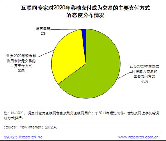 CTI論壇(ctiforum)6月13日消息(記者 楊佳林):據(jù)iResearch艾瑞咨詢整理Pew Internet調(diào)查數(shù)據(jù)發(fā)現(xiàn),多數(shù)互聯(lián)網(wǎng)專家認(rèn)為2020年移動支付將取代現(xiàn)金和信用卡成為主流支付方式。其中,65%的受訪專家認(rèn)為到2020年,大多數(shù)消費者將采用智能刷卡終端進(jìn)行支付;然而33%的專家不贊成這種推測,他們認(rèn)為到2020年,現(xiàn)金和信用卡將仍然是主要的支付方式,消費者對NFC技術(shù)安全性的擔(dān)憂及主要貨幣電子轉(zhuǎn)換技術(shù)的限制會阻礙移動支付的進(jìn)一步發(fā)展。