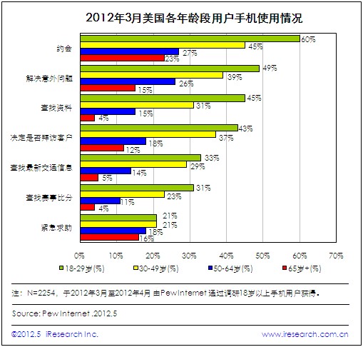 iResearch艾瑞咨詢根據(jù)Pew Internet 2012年5月發(fā)布的數(shù)據(jù)整理發(fā)現(xiàn),美國(guó)各年齡段手機(jī)用戶中,18-29歲的用戶使用手機(jī)程度最為頻繁,主要用于“約會(huì)”“解決意外問題”及“查找資料”上。相比其他年齡段用戶群,年輕用戶更偏向利用移動(dòng)手機(jī)來獲取信息。