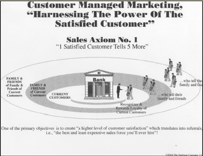 客戶滿意的影響范圍如下圖所示,客戶滿意的力量從里向外逐層波及,以現(xiàn)有客戶的滿意為基礎(chǔ),然后通過推薦傳遞到新的客戶。其傳遞路徑為“現(xiàn)有客戶”——“現(xiàn)有客戶的家人及朋友”——“現(xiàn)有客戶的家人及朋友的家人及朋友”…一直延伸下去最終使企業(yè)的營銷策略大獲成功,這一切的動力都來自于“更高的客戶滿意度引起的客戶行為”。這個營銷公式要取得長期成功沒有任何秘密,它失敗的風險被最小化,因為它依靠的是客戶積極的行動和表現(xiàn),以久經(jīng)考驗的銷售公理——“1個滿意的客戶會把自己的愉快經(jīng)歷告訴5個以上的人。”——為基礎(chǔ)。