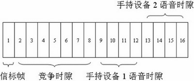 根據(jù)設(shè)計的特點,無線語音網(wǎng)關(guān)同手持設(shè)備間的無線網(wǎng)絡(luò)采用星型拓?fù)浣Y(jié)構(gòu),無線語音網(wǎng)關(guān)作為無線個域網(wǎng)的協(xié)調(diào)器同手持設(shè)備進(jìn)行信息交互。IEEE802.15.4MAC層分為使用信標(biāo)幀和不使用信標(biāo)幀兩種工作模式,本設(shè)計采用使用信標(biāo)幀同步的超幀結(jié)構(gòu),由無線語音網(wǎng)關(guān)發(fā)送信標(biāo)幀同步無線手持設(shè)備的數(shù)據(jù)傳輸。本設(shè)計中超幀長30ms,等分為16個時隙,每個時隙為1.875ms。信標(biāo)幀在時隙1發(fā)送,時隙2到時隙8為競爭時隙,使用時隙CSMA-CA算法傳輸命令幀和應(yīng)答幀。時隙9到時隙16固定分配給兩個手持設(shè)備作為上下行語音數(shù)據(jù)通道。上下行各兩個時隙的分配可以滿足經(jīng)