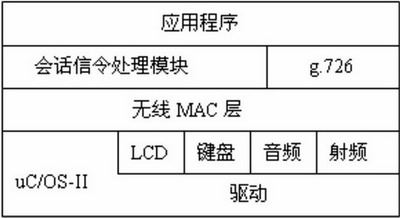 操作系統(tǒng)之上是無線MAC層,該模塊針對語音無線傳輸?shù)奶攸c簡化實現(xiàn)了IEEE 802.15.4 協(xié)議MAC層功能。第三層為語音壓縮編解碼g.726模塊和無線網(wǎng)內(nèi)部會話信令處理模塊。會話信令處理模塊負(fù)責(zé)處理來自無線語音網(wǎng)關(guān)的會話信令。最上層為應(yīng)用層,實現(xiàn)用戶界面和通話過程控制。無線手持設(shè)備總統(tǒng)框架如圖6所示。