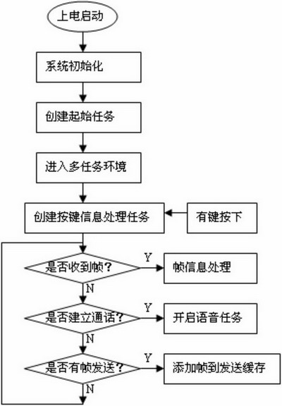當(dāng)手持設(shè)備上電啟動后,其工作流程如圖7示。首先進(jìn)行的是系統(tǒng)的初始化,包括處理器初始化,操作系統(tǒng)mC/OS-II初始化,LCD,鍵盤,射頻模塊等的初始化。之后建立起始任務(wù)并通過OSStart()函數(shù)進(jìn)入多任務(wù)環(huán)境。此時起始任務(wù)占用CPU資源,在起始任務(wù)中,建立按鍵信息處理任務(wù)并通過信號量機制掛起。然后判斷是否收到來自無線語音網(wǎng)關(guān)的幀,如果有,調(diào)用frame_deal()函數(shù)處理幀信息,在該函數(shù)中調(diào)用call_command_deal()完成無線網(wǎng)內(nèi)部會話信令的處理。接著判斷通話是否建立,如果建立則創(chuàng)建語音任務(wù),在語音進(jìn)程中使能PCM編解碼芯片,并進(jìn)行g(shù).726壓縮編碼。最后判斷是否有幀需要發(fā)送給無線語音網(wǎng)關(guān),如果有則把幀添加到發(fā)送緩存,等待發(fā)送時隙到來。這一過程完成以后重新跳到判斷是否收到來自無線語音網(wǎng)關(guān)的幀,重復(fù)以上過程。如果有鍵盤中斷,將會釋放一個信號量,該信號量將解掛按鍵信息處理任務(wù)。該任務(wù)對鍵盤輸入信息進(jìn)行處理。
