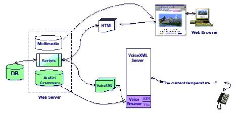 VoiceXml 1.0規(guī)范基于W3C的工業(yè)標(biāo)準(zhǔn)XML,為語(yǔ)音和電話應(yīng)用的開發(fā)者,服務(wù)提供商和設(shè)備制造商提供了一個(gè)智能化的API。VoiceXml的標(biāo)準(zhǔn)將簡(jiǎn)化WEB上具有語(yǔ)音響音服務(wù)的個(gè)性化界面的創(chuàng)建,使人們能夠通過語(yǔ)音和電話訪問網(wǎng)站上的信息和服務(wù),同時(shí)與CGIPERLPHP,C,JAVA SERVLET等)的腳本結(jié)合在一起來檢索后臺(tái)數(shù)據(jù)庫(kù),訪問企業(yè)內(nèi)部網(wǎng),從而最終將語(yǔ)音瀏覽器與微型瀏覽器融合在一起,實(shí)現(xiàn)計(jì)算機(jī)網(wǎng)絡(luò)與電話技術(shù)的完美結(jié)合。其具體的系統(tǒng)結(jié)構(gòu)如下: