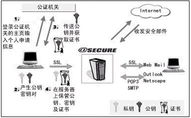 簡單來說,PKI就是由發(fā)布機構(gòu)發(fā)布證書給PKI的用戶,證書中含有用戶公共密鑰和個人密鑰的信息,由證書、證書授權(quán)機構(gòu)CA和實體三部分組成。PKI的用戶利用個人密鑰簽發(fā)信息或解密收到的信息,而其他用戶則使用對應(yīng)公共密鑰收發(fā)信息;赑KI的設(shè)計,采用統(tǒng)一的證書分配、管理策略以及共同的可靠性驗證機制,一方面可以保證E-mail的安全性,另一方面還可以解決現(xiàn)有不同系統(tǒng)無法進(jìn)行通信的弊病。因此,現(xiàn)有推出的一些優(yōu)秀E-mail系統(tǒng)如3R Soft推出的@SECURE都是基于PKI進(jìn)行設(shè)計的。通過數(shù)據(jù)加密的辦法只能保證郵件的機密性,卻無法完全保證郵件的完整性和不可抵賴性,即不能保證郵件在傳輸過程中不被他人篡改,且不被人冒名頂替發(fā)送。數(shù)字簽名可以有效地阻止這一現(xiàn)象,即在發(fā)送E-mail的同時,加上一個Hash冗余信息。發(fā)送者使用Hash函數(shù)創(chuàng)建信息的摘要,作為信息數(shù)字指紋,然后用個人密鑰加密信息摘要,加密后的信息摘要就是數(shù)字指紋。目前較為常用的,如在 @SECURE 中采用的MD5算法,它是一種單向散列算法,大小為128比特,經(jīng)計算,它被仿制的概率小于1/265,符合安全性的需要。