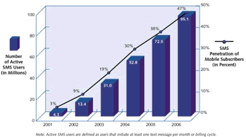 文本到文本消息作為亞太生活習(xí)慣已經(jīng)很多年, 并且繼續(xù)發(fā)展為更加復(fù)雜的. 鈴聲下載, 閃動的字符, 客戶產(chǎn)品購買, 新聞/股票更新使這個地區(qū)非常通常的SMS的使用. 用戶在其他地區(qū)發(fā)送的消息通常是每月幾十條, 在亞太, 用戶在相同時間里發(fā)送幾百條SMS消息是司空見慣的.