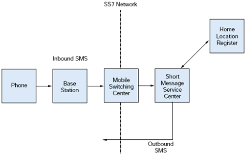 從MSC, SMS消息在SS7網(wǎng)絡(luò)中發(fā)送到短消息中心(SMSC), 一個網(wǎng)絡(luò)的標(biāo)準(zhǔn)部分. SMSC向Home Location Register (HLR)查詢消息的接收者在什么地方以及他的手機是否開機可以接受一個消息. 如果不可以, SMSC就把消息存儲直到它被發(fā)出. 請見圖2.